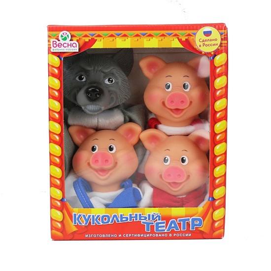 В комплект кукольного театра Весна 4 персонажа входят 4 перчаточные куклы, с которыми можно разыгрывать кукольные спектакли: Веселый поросенок 1, Веселый поросенок 2, Веселый поросенок 3, Волк. В комплекте нет ширмы.