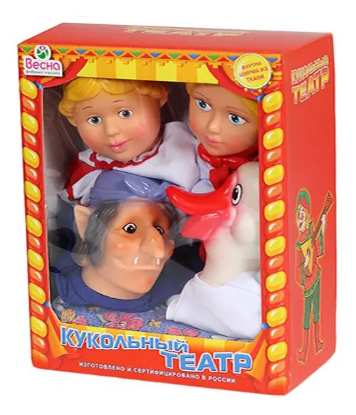 В комплект кукольного театра входят 4 перчаточные куклы, с которыми можно разыгрывать кукольные спектакли: Аленушка, Иванушка, Баба-Яга, Гусь.